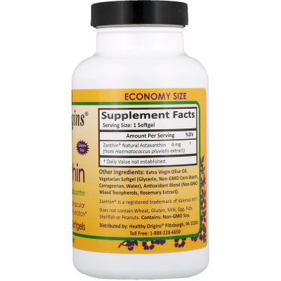 Astaxantin značky Zanthin v tomto produktu je karotenoid produkovaný mikroorganismy Haematococcus pluvialis. Astaxantin je důležitý karotenoid, poskytující řadu příznivých vlivů. Veganský Astaxanthin od společnosti Healthy Origins využívá patentovaný proces DeepExtract, využívající extrakci pomocí superkritického CO2 a blokaci peroxidace, jež zajišťují dlouhodobou stabilitu a účinnost astaxanthinu v olejové suspenzi.