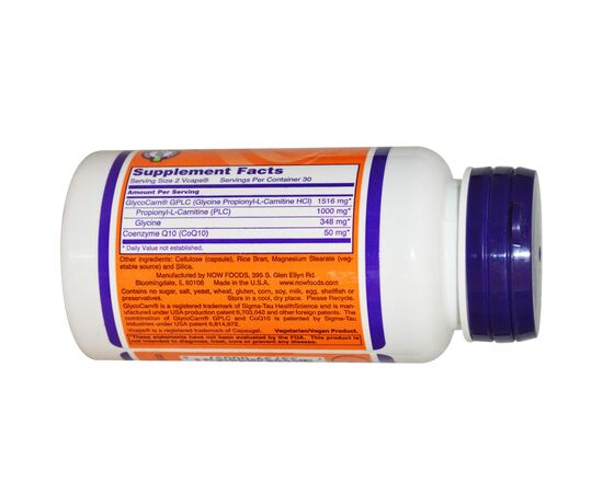 GlycoCarn (Glycine Propionyl-L-Carnitine) GPLC is a patented, highly bioavailable form of Carnitine. Carnitine is an amino acid that plays a crucial role in muscle function by regulating energy flow across cell membranes during exercise. GlycoCarn, particularly when combined with exercise, has been shown to increase nitric oxide (NO) levels in the blood. NO is known for its vasodilating effects, which help to enhance blood flow to muscles and vital organs of the body, especially the heart. By optimizing the delivery of oxygen and nutrients to the muscles, NO facilitates the production of ATP (energy at the cellular level) and aids in the removal of lactic acid and other metabolic waste products from muscle tissue. Clinical studies have demonstrated that GPLC can provide aerobic power, thereby supporting increased stamina, endurance, and recovery. NOW GPLC also contains CoQ10 for synergistic support of cardiovascular health.