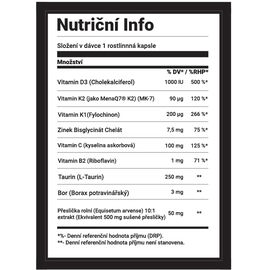 A first-class product containing 9 indispensable substances in the correct dosage. Vitamin D3, Vitamin K1, Vitamin K2 (MK-7 brand MenaQ7), Vitamin C, Vitamin B1, Taurine, Zinc, Boron and Silicon as horsetail extract, providing bioavailable silicon. It contains quality ingredients that are difficult to find in food, especially on a daily basis. It is focused on the basic needs of the body to maintain youth and achieve a long life, namely the heart, bones and immunity. All this in vegetable capsules without any auxiliary substances, fillers or other auxiliary ingredients. The product was developed for long-term use and many individual components have a synergistic effect to maximize benefits.