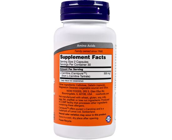 L-Carnitine is a non-essential amino acid that helps to maintain overall good health by facilitating the transfer of fatty acid groups into the mitochondrial membrane for cellular energy production. It naturally occurs in red meat and other animal source foods, but we recommend supplementation to obtain optimal levels of this excellent amino acid. NOW L-Carnitine is the purest form, clinically tested, and vegetarian (non-animal sourced).