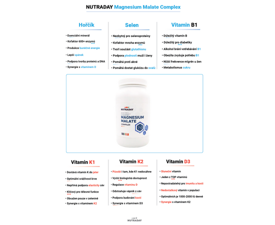 Premium magnesium in the form of malate, without the adverse side effects of other forms. Thanks to the high concentration of magnesium malate, only 1-2 capsules per day are sufficient. Added synergistic ingredients such as vitamin D3, K1, B1 and C plus a low dose of selenium in a well-absorbable form make it an ideal mineral supplement. The product is intended as a stand-alone product, but the ideal coverage of the supplied nutrients can be achieved by combining this product with the D3 & K2 Complex product. It supplies, among other things, important natural Vitamin K2, Zinc bisglycinate, Boron, Silicon and further strengthens the synergy between magnesium and vitamins D and K. By combining these products, you can achieve an ideal multivitamin in ideal doses and without unwanted and redundant elements.