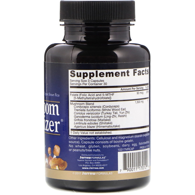 Mushroom Optimizer® je vynikající směs 7 druhů hub pěstovaných na organické hnědé rýži. Obsažené houby včetně shiitake, reishi a cordyceps jsou specificky vybírány tak, aby se vzájemně doplňovaly poskytováním spektra polysacharidů pro podporu imunitního systému, funkce buněk a vytrvalosti. Mushroom Optimizer® obsahuje také Quatrefolic®, biologicky aktivní folát (5-MTHF [5-methyltetrahydrofolát]) spolu se spektrem polysacharidů. Naštěstí přípravek Jarrow Formulas Mushroom Optimizer obsahuje výtažky ze sedmi druhů hub s obsahem živin, včetně shiitake, reishi a cordyceps. Vzorec bez GMO a bezlepku je ideálním přírodním doplňkem k revitalizaci systémů vašeho těla.