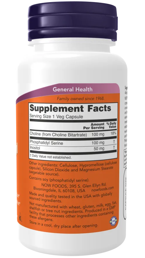 NOW® Phosphatidyl Serine is a phospholipid compound derived from soy lecithin that plays a vital role in cell membrane composition and intercellular communication. Phosphatidyl serine is a major structural component of nerve membranes, where it aids in the conduction of electrical impulses and facilitates the activity of neurotransmitters involved in learning, memory and mood. These properties make NOW® Phosphatidyl Serine an excellent cognitive support supplement.