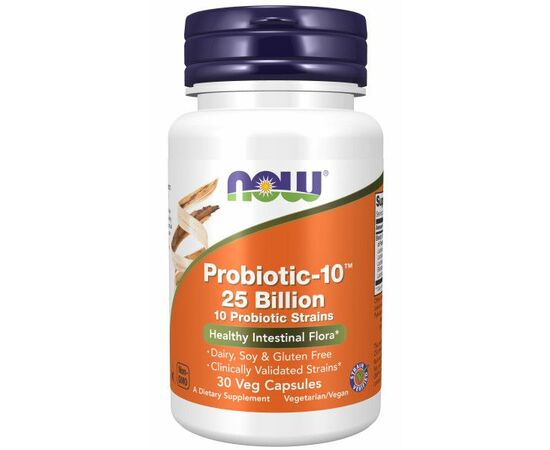 NOW Probiotic-10 nabízí vyvážené spektrum živých organismů sestávající z kyselinovzdorných probiotických bakteriálních kmenů, o kterých je známo, že přirozeně kolonizují lidský střevní trakt. Probiotické bakterie jsou klíčové pro zdravé trávení, pomáhají udržovat integritu střevní výstelky, podporují správnou střevní motilitu a podílejí se na detoxikačním procesu. Tato účinná receptura Probiotic-10 dodává 100 miliard živých organismů, které pomáhají obnovit zdravou flóru po občasném, ale dočasném narušení střevní rovnováhy.