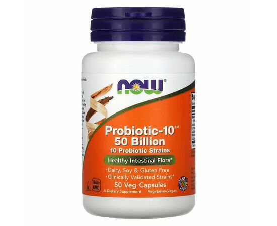 NOW® Probiotic-10™ nabízí vyvážené spektrum živých organismů sestávající z kyselinovzdorných probiotických bakteriálních kmenů, o kterých je známo, že přirozeně kolonizují lidský střevní trakt. Probiotické bakterie jsou klíčové pro zdravé trávení, pomáhají udržovat integritu střevní výstelky, podporují správnou střevní motilitu a podílejí se na detoxikačním procesu. Probiotic-10 využívá bakteriální kmeny, které byly vybrány pro podporu imunitního systému.