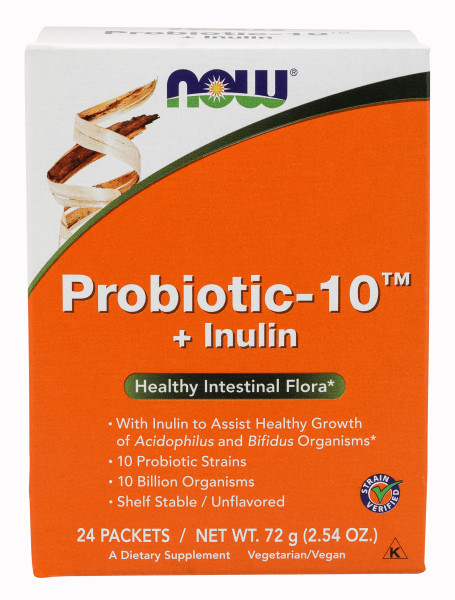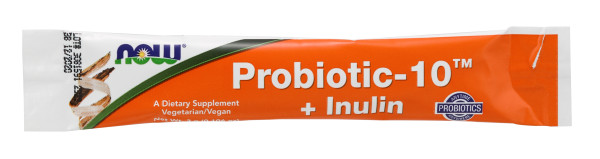 Každý balíček NOW Probiotic-10 ™ obsahuje nejméně 10 miliard živých organismů sestávajících z probiotických bakteriálních kmenů, o nichž je známo, že kolonizují lidský Gl trakt a navíc prebiotickou vlákninu inulin, pro podporu růstu vyváženého spektra organismů v celém střevním traktu.