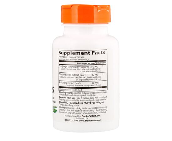 The Cordyceps in this product is recognized by the Chinese government as similar to wild Cordyceps sinensis, a rare mushroom that grows at high altitudes in the Tibetan Highlands of China. Ginkgo biloba and artichoke leaf extracts are added to support the rejuvenating effects of cordyceps. It helps to increase energy, vitality and endurance. Supporting memory and mental abilities.
