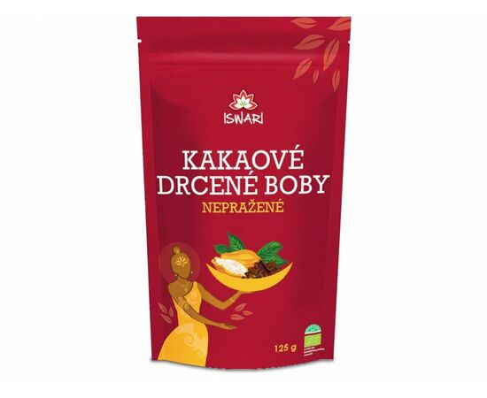 Nepražené kakaové boby - drcené. Kakaové boby od Iswari jsou sušená semena plodů kakaovníku Arriba. Díky jejich šetrnému zpracování při nízkých teplotách (bez pražení) jsou v nich zachovány všechny bohaté nutriční látky, díky nimž bývalo kakao Indiány právem nazýváno pokrmem Bohů. Vychutnejte si kakao v jeho nejčistší podobě! Proč nepražené kakao? Obsahuje enzymy dobré nálady Mimořádné hodnoty antioxidantů Bohaté na nenasycené mastné kyseliny omega 6 Obsahuje zejména hořčík, železo, síru, chrom, mangan a zinek v Bio kvalitě a 100% Raw (Živá strava) Nepražené kakaové boby nebyly tepelně, ani chemicky ošetřeny, proto byly zachovány veškeré původní enzymy, vitamíny a minerály z této jedinečné plodiny. Použití: Přidejte do müsli, dezertů, jogurtů, ranních cereálií, apod. Truffels s kakaovými boby a goji: 1 lžička kakaových bobů, 1 lžička goji, 1 lžička kokosového oleje, 1 lžička karobového prášku, 4 mandle, 5 datlí. Vše společně nasekejte v robotu na hrubou směs, která půjde tvarovat. Vytvořte truffles. Servírujte na talíři posypané karobovým práškem. Dobrou chuť!