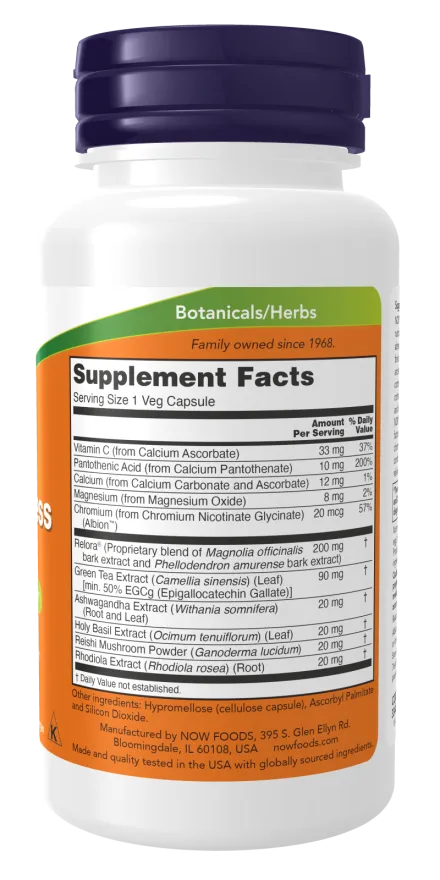 Složení v dávce 1 rostlinná kapsle : Vitamín C (z askorbátu vápenatého) 33 mg (41 %*); Kyselina pantotenová (z pantothenátu vápenatého) 10 mg (200 %*); Vápník (z uhličitanu vápenatého a askorbátu) 12 mg (1,5 %*); Hořčík (z oxidu hořečnatého) 8 mg (2 %*); Chrom (z Chromium Nicotinate Glycinate) (Albion™) 20 mcg (50 %*); Relora® (proprietární směs extraktu z kůry Magnolia officinalis a extraktu z kůry Phellodendron amurense) 200 mg**; Extrakt ze zeleného čaje (Camellia sinensis) (list) [min. 50 % EGCg (epigalokatechin galát)] 90 mg**; Extrakt Ashwagandha (Withania somnifera) (kořen a list) 20 mg**; Extrakt z bazalky posvátné (Ocimum tenuiflorum) (list) 20 mg**; Prášek z hub Reishi (Ganoderma lucidum) 20 mg**; Extrakt z rozchodnice (Rhodiola rosea) (kořen) 20 mg**; * - Referenční hodnota příjmu ; **- Denní referenční hodnota příjmu není stanovena.