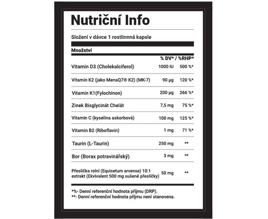 Prvotřídní produkt obsahující 9 nepostradatelných látek ve správném dávkování. Vitamín D3, Vitamín K1, Vitamín K2 (MK-7 značky MenaQ7), Vitamín C, Vitamín B1, Taurin, Zinek, Bór a Křemík jako extrakt z přesličky, poskytující biodostupný křemík.